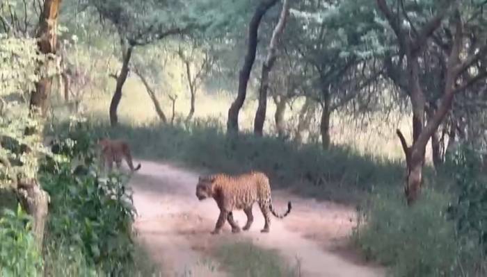 बीच ट्रैक में दिखे तीन लेपर्ड, पलभर को थम गया सफारी का रोमांच
